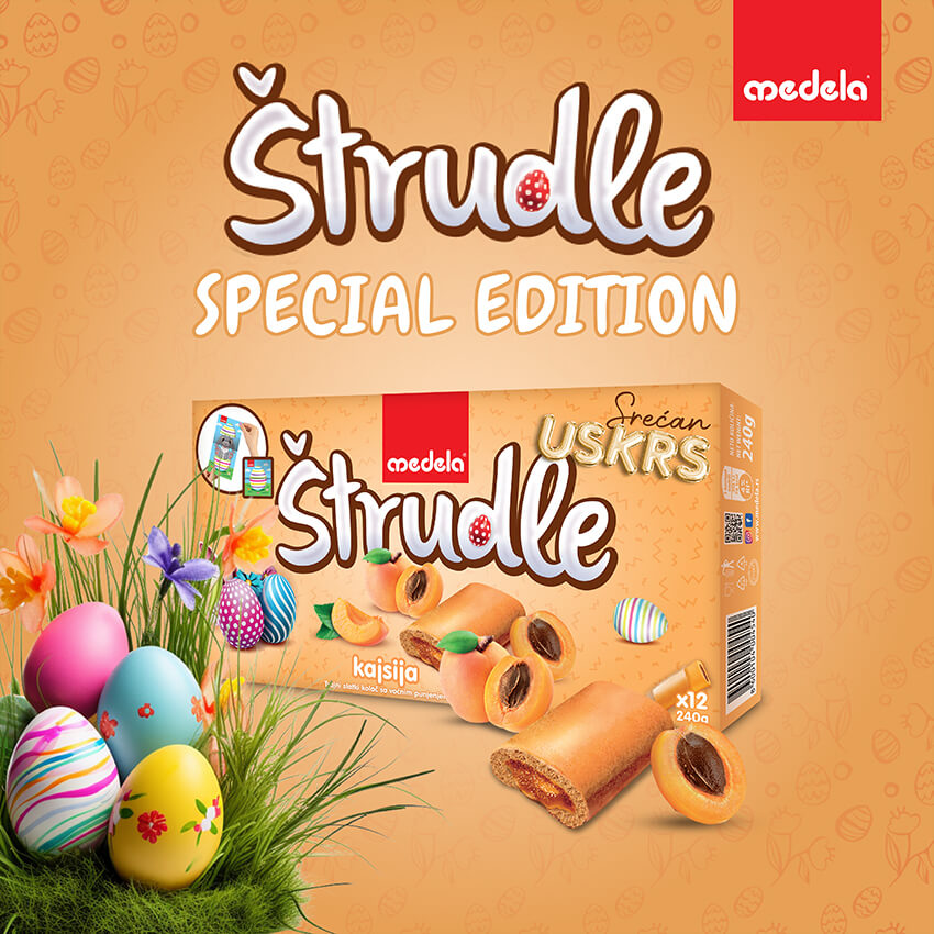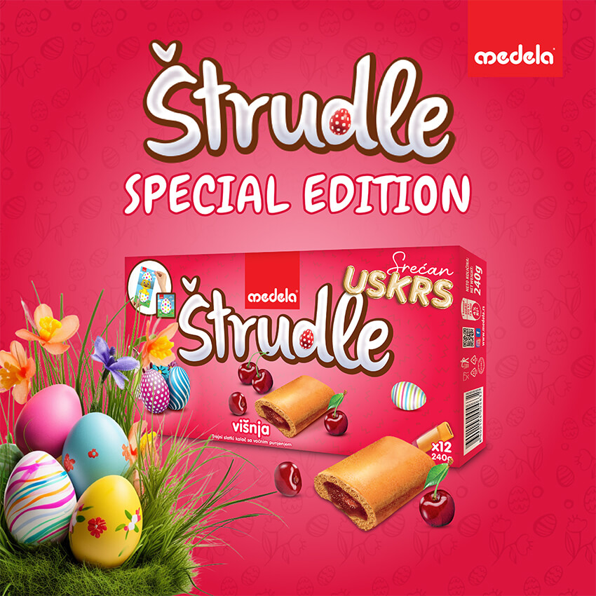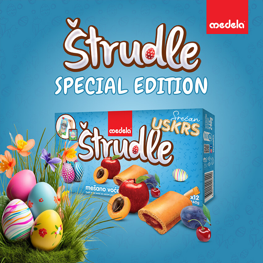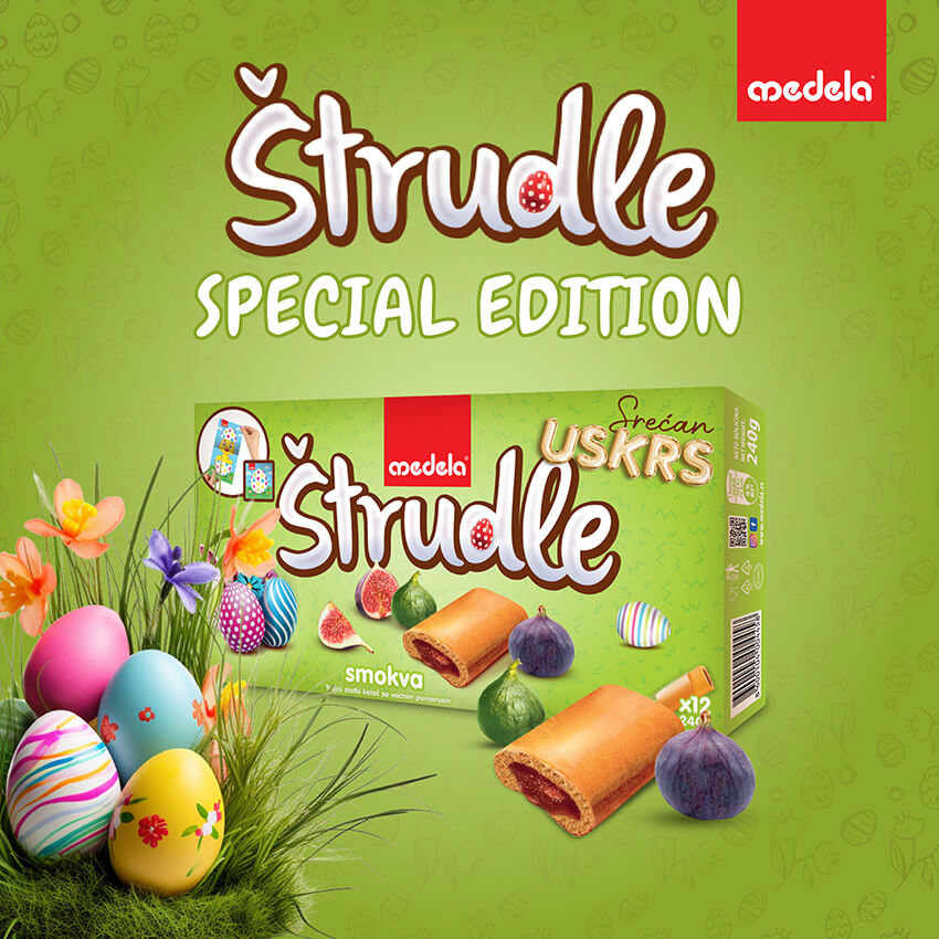 This year, we have once again prepared your favorite Strudlas in limited Easter packaging. On the back of the box, you will find a perforated Easter-themed cut-out (bunny, egg) designed for children to play with and spark their creativity.