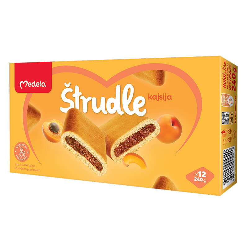 Sastojci: voćno punjenje kajsija (33%) (voćne kaše: jabuka, kajsija 2%; šećer, glukozni sirup, regulator kiselosti: limunska kiselina; aroma, konzervans: kalijum sorbat), PŠENIČNO brašno (GLUTEN), šećer, voda (10%), margarin [delimično hidrogenizovano biljno ulje (SOJA), mešavina biljnih ulja (palma, suncokret, palmina koštica), voda, emulgatori: E 471, SOJIN lecitin; konzervans: sorbinska kiselina; regulator kiselosti: limunska kiselina; aroma, boja: E 160a], JAJA, ekstrakt JEČMENOG slada (GLUTEN), SURUTKA u prahu (MLEČNI PROIZVOD), humektant: E 420(ii); obrano MLEKO u prahu, kuhinjska so, sredstva za dizanje testa: E 500(ii), E 503(ii); emulgator: SOJIN lecitin; aroma. Može da sadrži LEŠNIK.